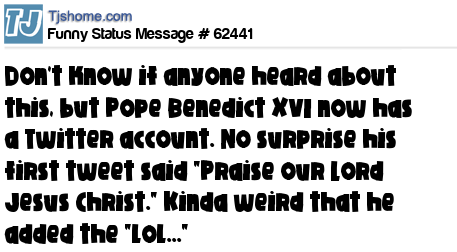 X Don't know if anyone heard about this, but Pope Benedict XVI now has a Twitter account. No surprise his first tweet said "Praise our Lord Jesus Christ." Kinda weird that he added the "lol..."