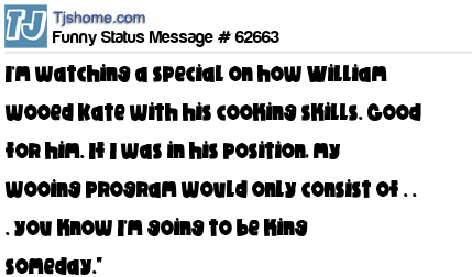 X is I'm watching a special on how William wooed Kate with his cooking skills. Good for him. If I was in his position, my wooing program would only consist of . . . you know I'm going to be king someday."