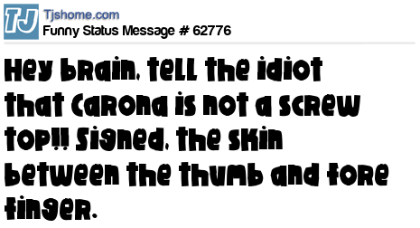 X Hey brain, tell the idiot that Carona is not a screw top!! Signed, the skin between the thumb and fore finger.