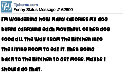 X I'm wondering how many calories my dog burns carrying each mouthful of her dog food all the way from the kitchen into the living room to eat it, then going back to the kitchen to get more. Maybe I should do that.