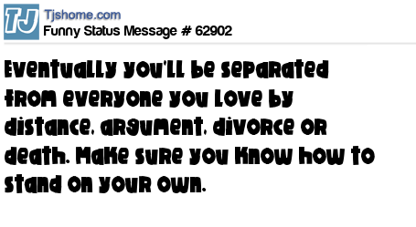 X Eventually you'll be separated from everyone you love by distance, argument, divorce or death. Make sure you know how to stand on your own.