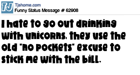 X says I hate to go out drinking with unicorns, they use the old "no pockets" excuse to stick me with the bill.