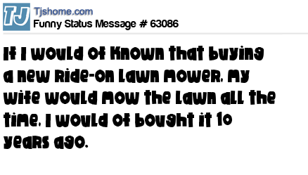 X says if I would of known that buying a new ride-on lawn mower, my wife would mow the lawn all the time, I would of bought it 10 years ago.