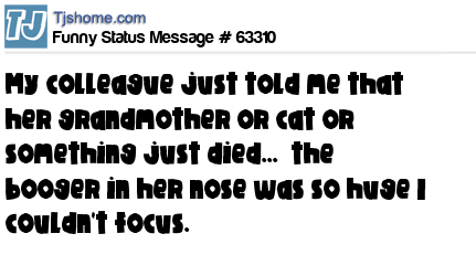 X My colleague just told me that her grandmother or cat or something just died... the booger in her nose was so huge I couldn't focus.
