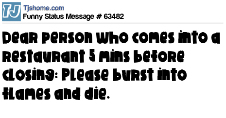 X Dear person who comes into a restaurant 5 mins before closing: Please burst into flames and die.