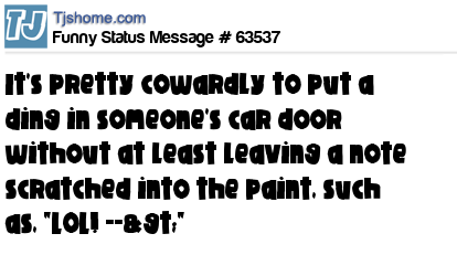 - # 62897 It's pretty cowardly to put a ding in someone's car door without at least leaving a note scratched into the paint, such as, "LOL! --->"