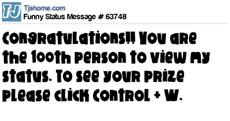 X is Congratulations!! You are the 100th person to view my status. To see your prize please click Control + W.