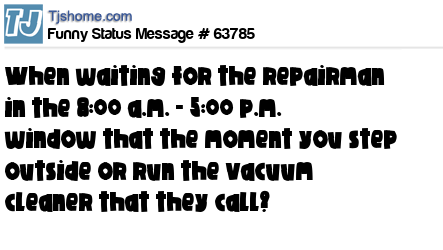 X says When waiting for the repairman in the 8:00 a.m. - 5:00 p.m. window that the moment you step outside or run the vacuum cleaner that they call?