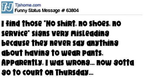 X I find those "No shirt, no shoes, no service" signs very misleading because they never say anything about having to wear pants. Apparently, I was wrong... now gotta go to court on Thursday...