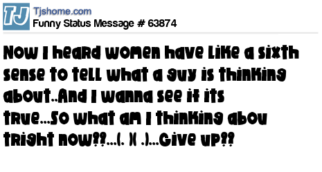X says Now I heard women have like a sixth sense to tell what a guy is thinking about..And I wanna see if its true...So what am I thinking abou tright now??...(. )( .)...Give up??