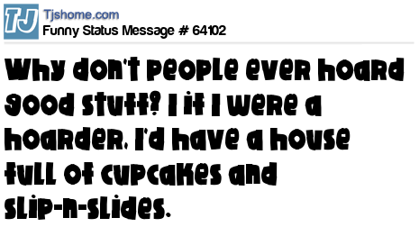 X Why don't people ever hoard good stuff? I if I were a hoarder, I'd have a house full of cupcakes and slip-n-slides.