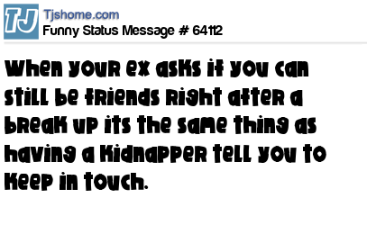 - # 58689 When your ex asks if you can still be friends right after a break up it's the same thing as having a kidnapper tell you to keep in touch.