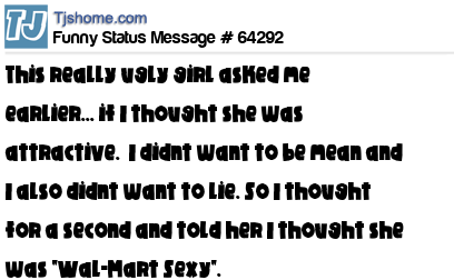 X is This really ugly girl asked me earlier... if I thought she was attractive. I didnt want to be mean and I also didnt want to lie. So I thought for a second and told her I thought she was "Wal-Mart Sexy".