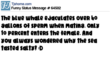 - # 74631 The blue whale ejaculates over 40 gallons of sperm when mating. Only 10 percent enters the female. And you always wondered why the sea tasted salty?