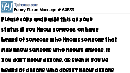 X is Please copy and paste this as your status if you know someone, or have heard of someone who knows someone that may know someone who knows anyone. If you don't know anyone, or even if you've heard of anyone who doesn't know anyone that doesn't know someone