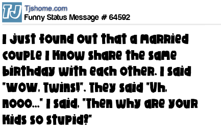 X I just found out that a married couple I know share the same birthday with each other. I said "WOW, Twins!". They said "Uh, nooo..." I said, "Then why are your kids so stupid?"