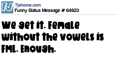 - # 104395 If you take the vowels out of FEMALE you get FML. Coincidence? I think not