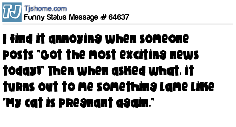 X I find it annoying when someone posts "Got the most exciting news today!" Then when asked what, it turns out to me something lame like "My cat is pregnant again."