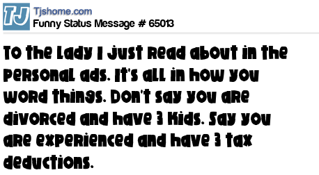 X To the lady I just read about in the personal ads. It's all in how you word things. Don't say you are divorced and have 3 kids. Say you are experienced and have 3 tax deductions.