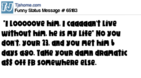 X is "I looooove him, I caaaaan't live without him, he is my life" No you don't, your 23, and you met him 6 days ago. Take your damn dramatic a$$ off FB somewhere else.