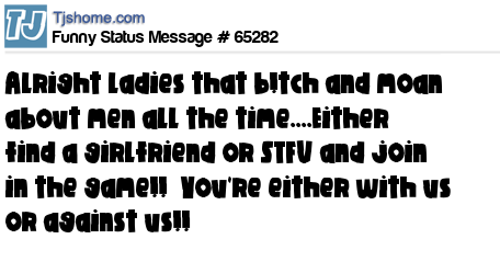 X is Alright ladies that b!tch and moan about men all the time....Either find a girlfriend or STFU and join in the game!! You're either with us or against us!!