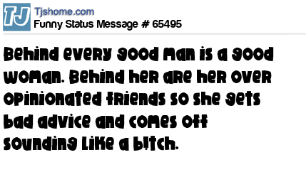 X Behind every good man is a good woman. Behind her are her over opinionated friends so she gets bad advice and comes off sounding like a b!tch.