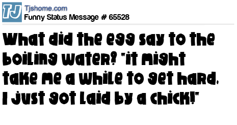 - # 62758 Like the egg said to the boiling water...It's going to take me a few minutes to get hard, I just got laid last night. Cluck cluck cluck cluck.