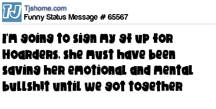 X is I'm going to sign my gf up for Hoarders, she must have been saving her emotional and mental bullsh!t until we got together