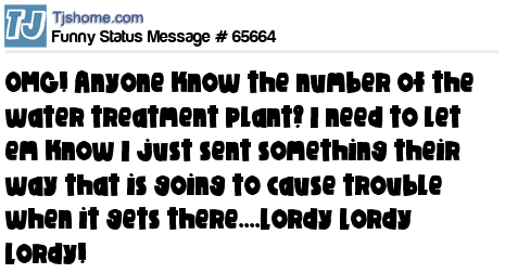 X OMG! Anyone know the number of the water treatment plant? I need to let em know I just sent something their way that is going to cause trouble when it gets there....Lordy Lordy Lordy!