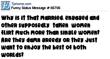 X says Why is it that married, engaged and other supposedly “taken” women flirt much more than single women? Are they damn greedy or they just want to enjoy the best of both worlds?