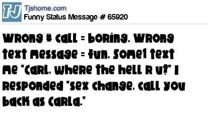 - # 65612 Wrong # call=boring. Wrong # text message=fun. Someone text me "Carl, where the hell r u?" I responded "sex change, call you back as Carla."