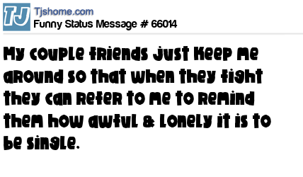 X says My couple friends just keep me around so that when they fight they can refer to me to remind them how awful & lonely it is to be single.