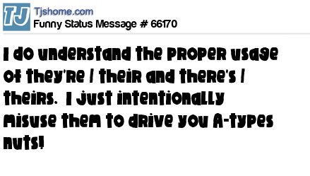 X I do understand the proper usage of they're / their and there's / theirs. I just intentionally misuse them to drive you A-types nuts!