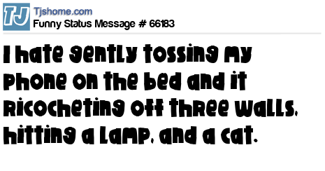 - # 93190 I hate when I throw my phone onto my bed and it decides to bounce off 3 walls, knock over a lamp, and kill a cat.