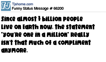 X Since almost 7 billion people live on Earth now, the statement "you're one in a million" really isn't that much of a compliment anymore.
