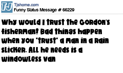 X says Why would I trust the Gordon's fisherman? Bad things happen when you "trust" a man in a rain slicker. All he needs is a windowless van