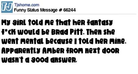 X My girl told me that her fantasy f*ck would be Brad Pitt. Then she went mental because I told her mine. Apparently Amber from next door wasn't a good answer,
