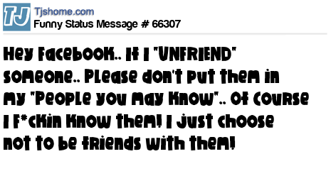 X is Hey Facebook.. If I "UNFRIEND" someone.. Please don't put them in my "People you may know".. Of Course I F*ckin know them! I just choose not to be friends with them!