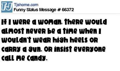 X If I were a woman, there would almost never be a time when I wouldn't wear high heels or carry a gun. Or insist everyone call me Candy.