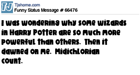 X I was wondering why some wizards in Harry Potter are so much more powerful than others. Then it dawned on me. Midichlorian count.