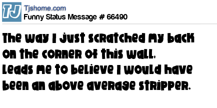 - # 208413 The way I just scratched my back on the corner of the wall, leads me to believe I would have been an above average stripper.