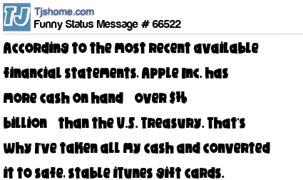 X According to the most recent available financial statements, Apple Inc. has more cash on hand—over $76 billion—than the U.S. Treasury. That's why I've taken all my cash and converted it to safe, stable iTunes gift cards.