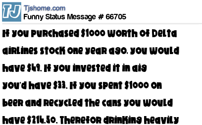 X is If you purchased $1000 worth of Delta airlines stock one year ago, you would have $49. If you invested it in aig you'd have $33. If you spent $1000 on beer and recycled the cans you would have $214.50. Therefor drinking heavily is your best investment.