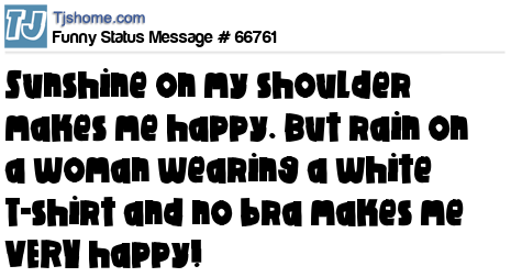 X Sunshine on my shoulder makes me happy. But rain on a woman wearing a white T-shirt and no bra makes me VERY happy!