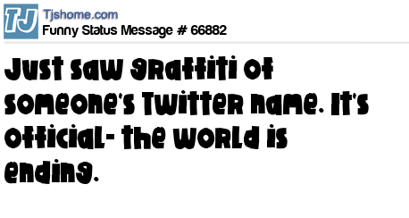 X says Just saw graffiti of someone's Twitter name. It's official- the world is ending.
