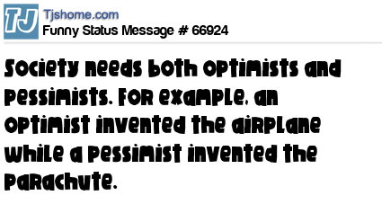 - # 66706 Society needs both optimists and pessimists. For example, an optimist invented the airplane while a pessimist invented the parachute