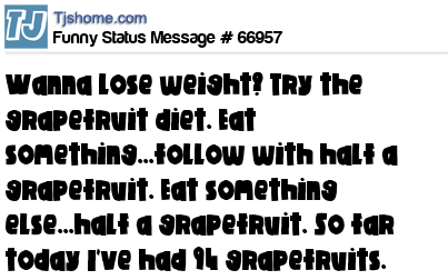 X Wanna lose weight? Try the grapefruit diet. Eat something...follow with half a grapefruit. Eat something else...half a grapefruit. So far today I've had 94 grapefruits.