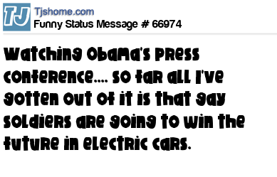 X is Watching Obama's press conference.... so far all I've gotten out of it is that gay soldiers are going to win the future in electric cars.
