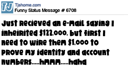 X just recieved an e-mail saying I inheirited $122,000, but first I need to wire them $1,000 to prove my identity and account numbers.....hmmm.....haha