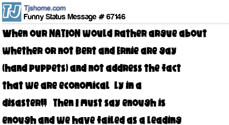 X is When our NATION would rather argue about whether or not Bert and Ernie are gay (hand puppets) and not address the fact that we are economically in a disaster!! Then I must say enough is enough and we have failed as a leading powerful country!!